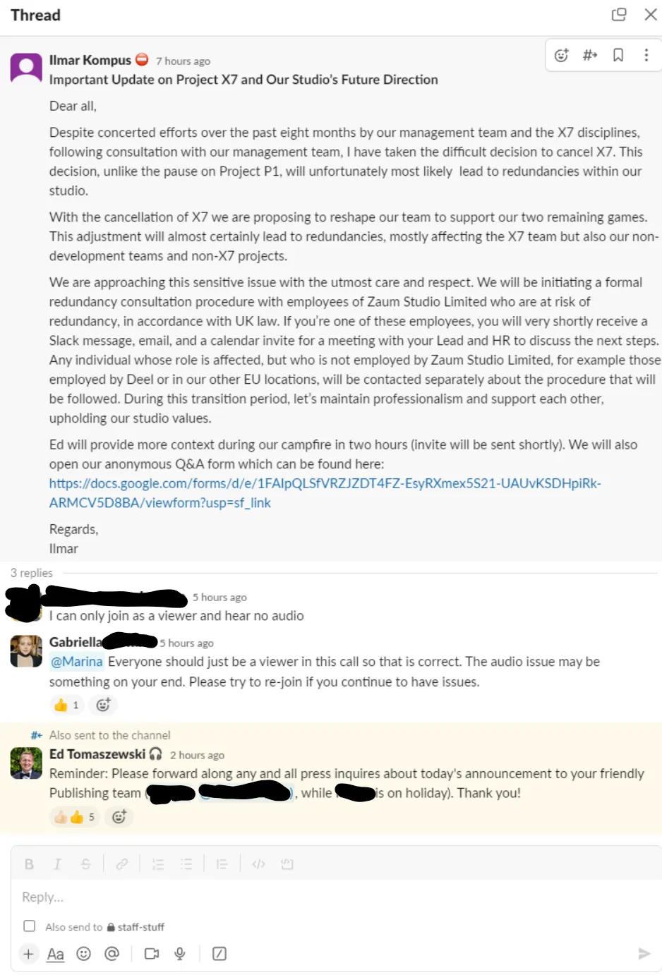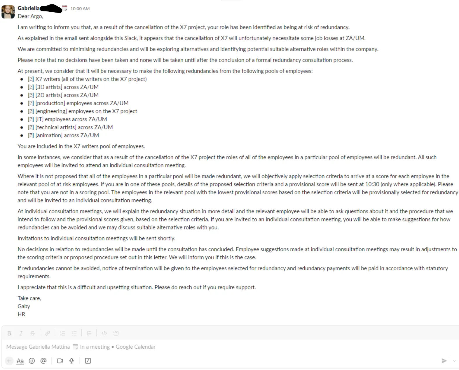 An hour after the redundancy announcement all-hands zoom call where for