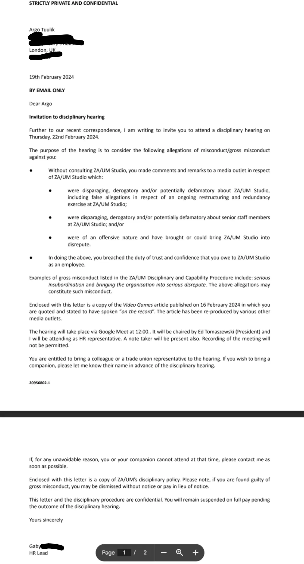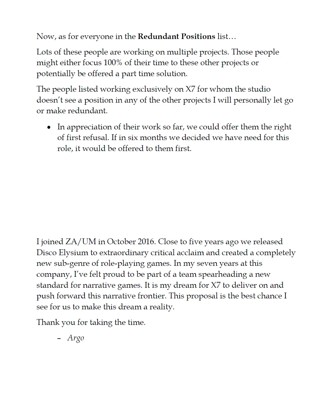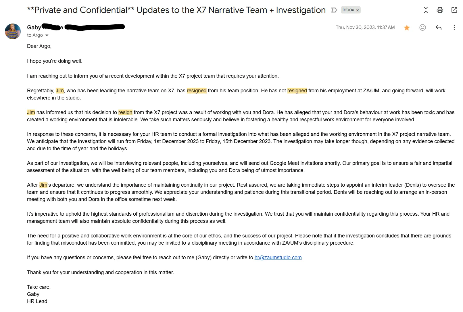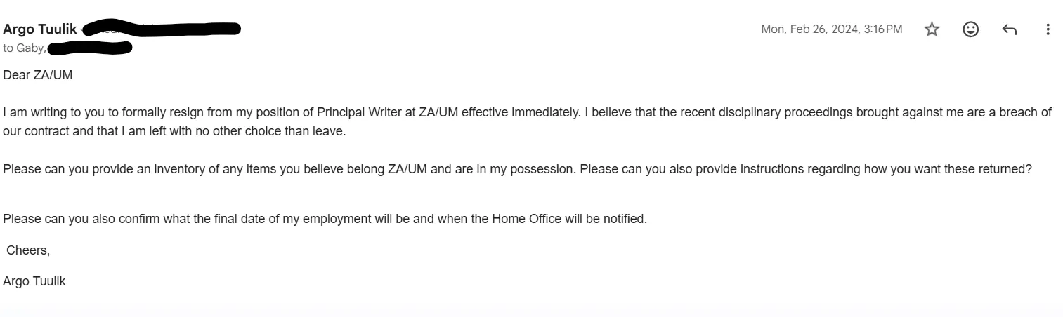 So on the advice of my trade union rep — bless the man, he was the real unsung hero of the story, amazing guy — I resign from my Principal Writer position in Zaum Studio on the 26th of February 2024.