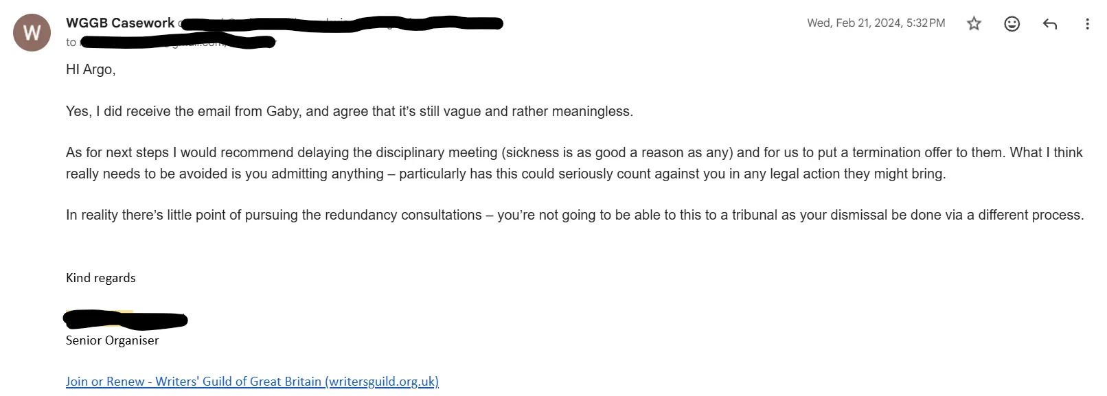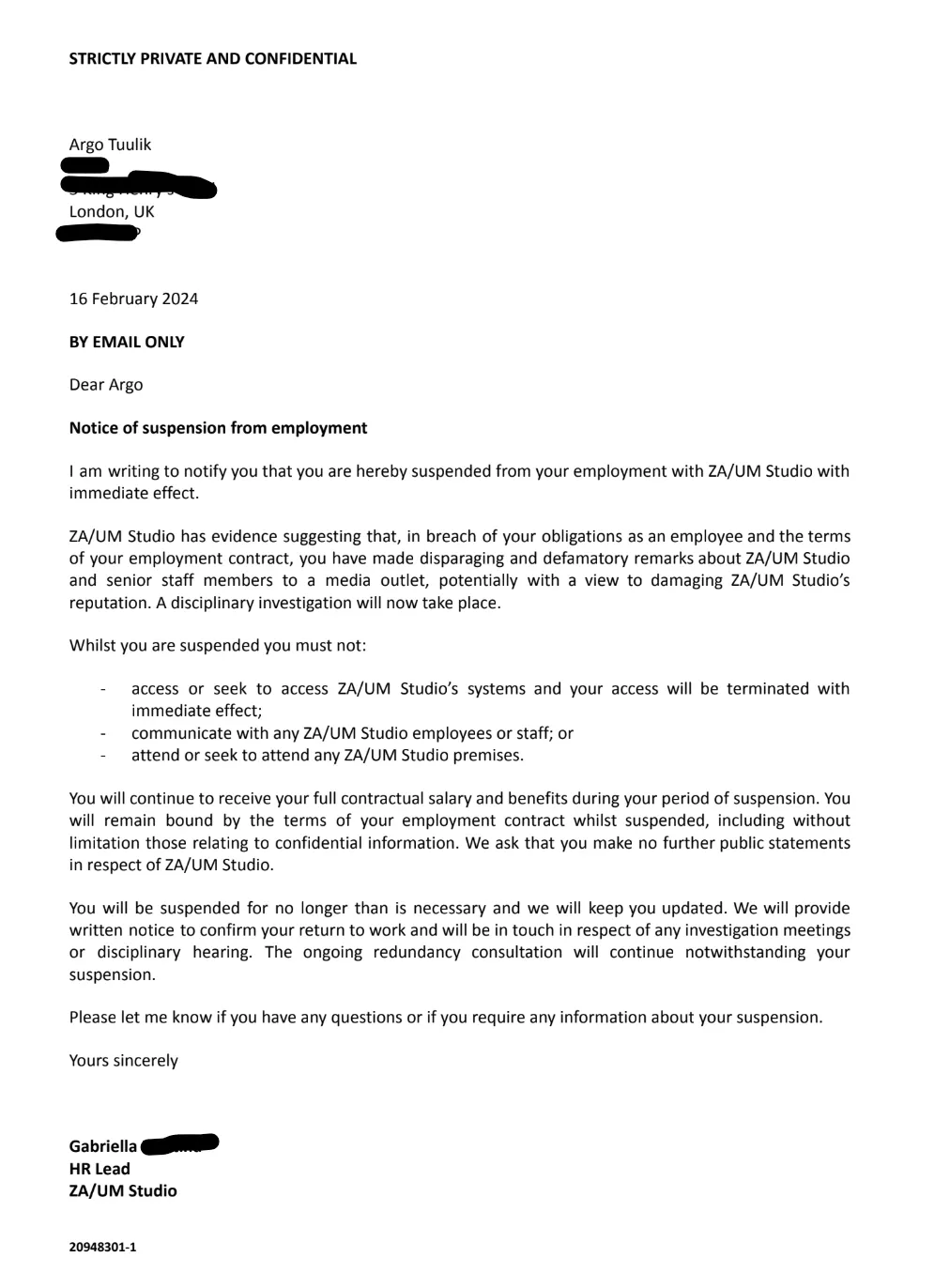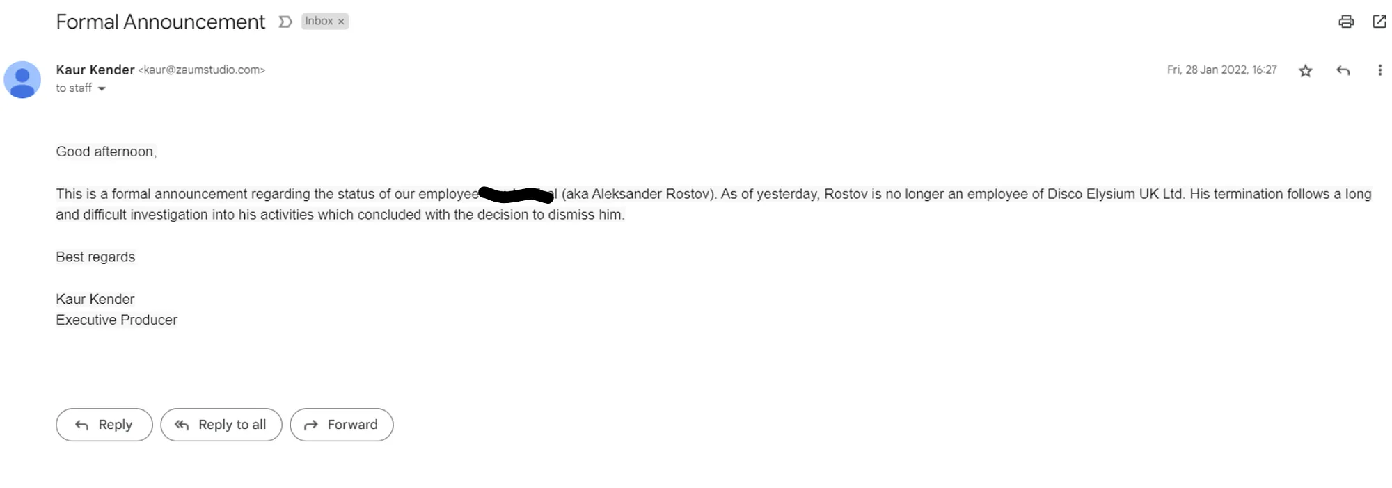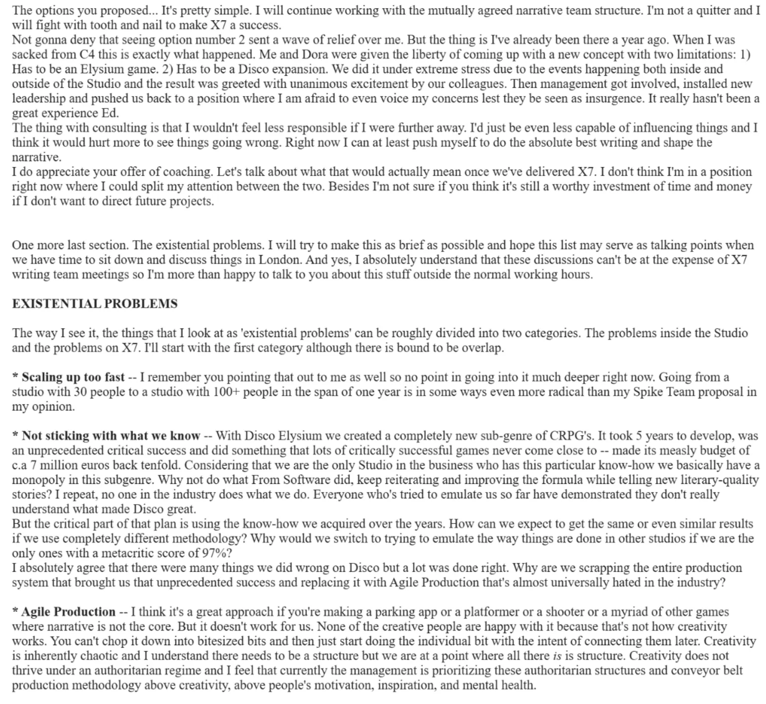 So on the advice of my trade union rep — bless the man, he was the real unsung hero of the story, amazing guy — I resign from my Principal Writer position in Zaum Studio on the 26th of February 2024.