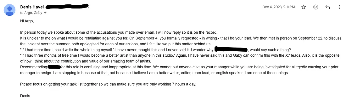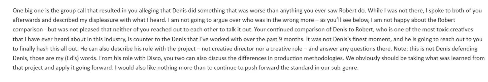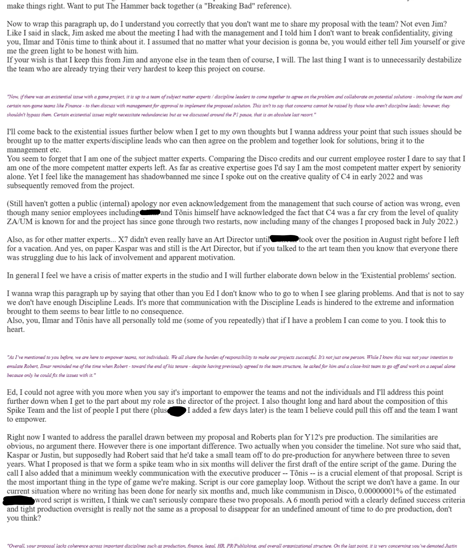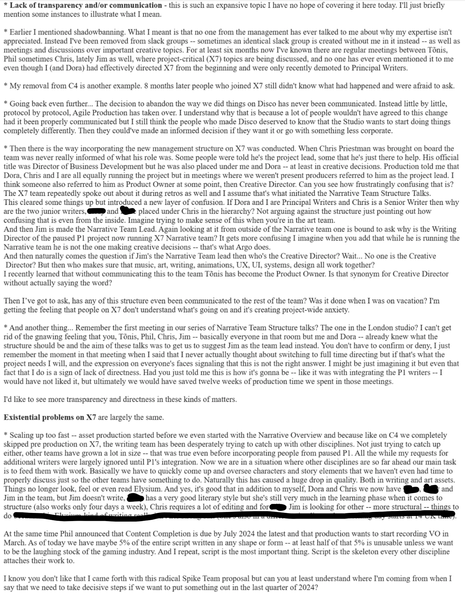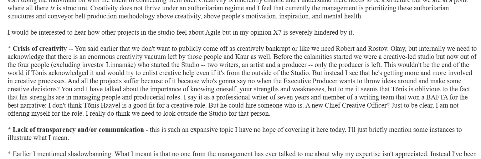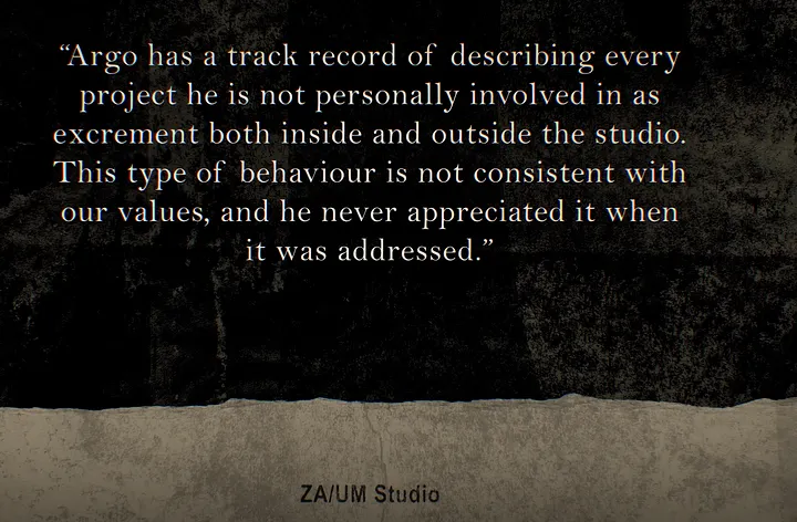 was the feedback of every other employee of the studio since the
