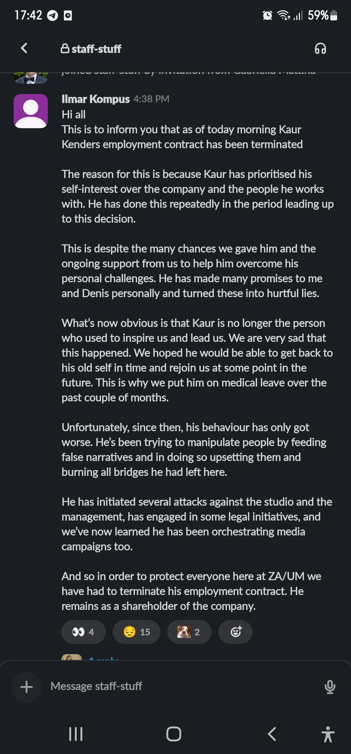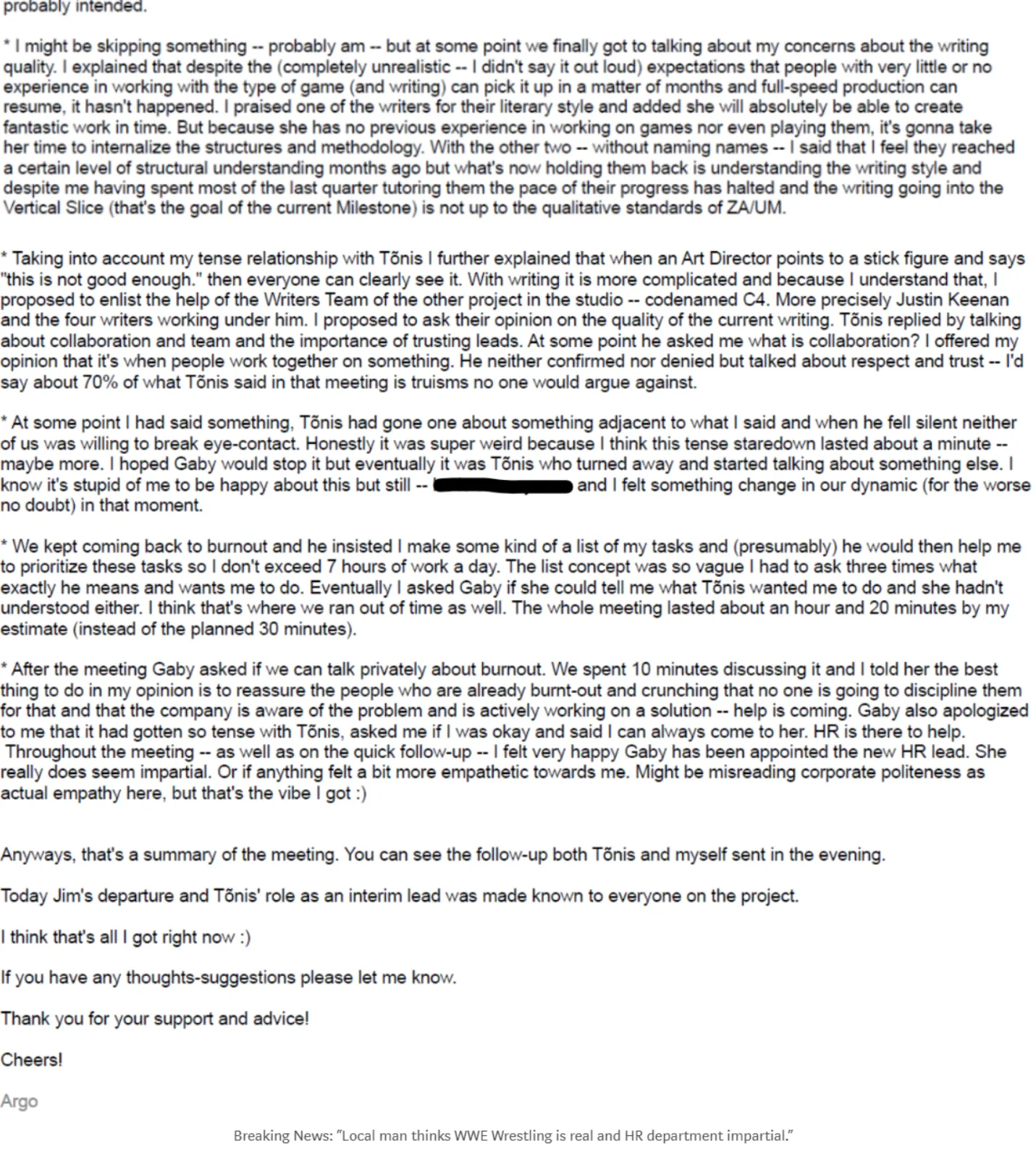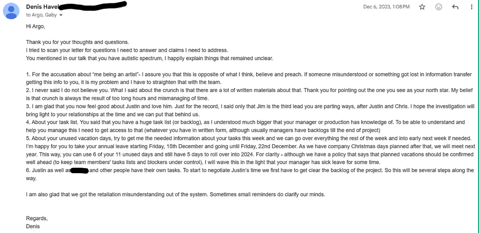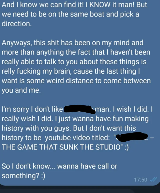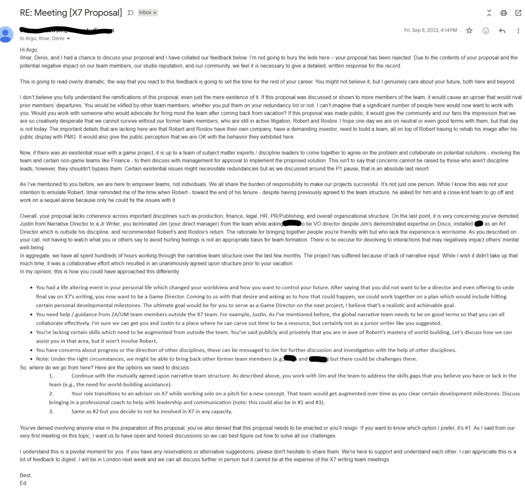 was the feedback of every other employee of the studio since the