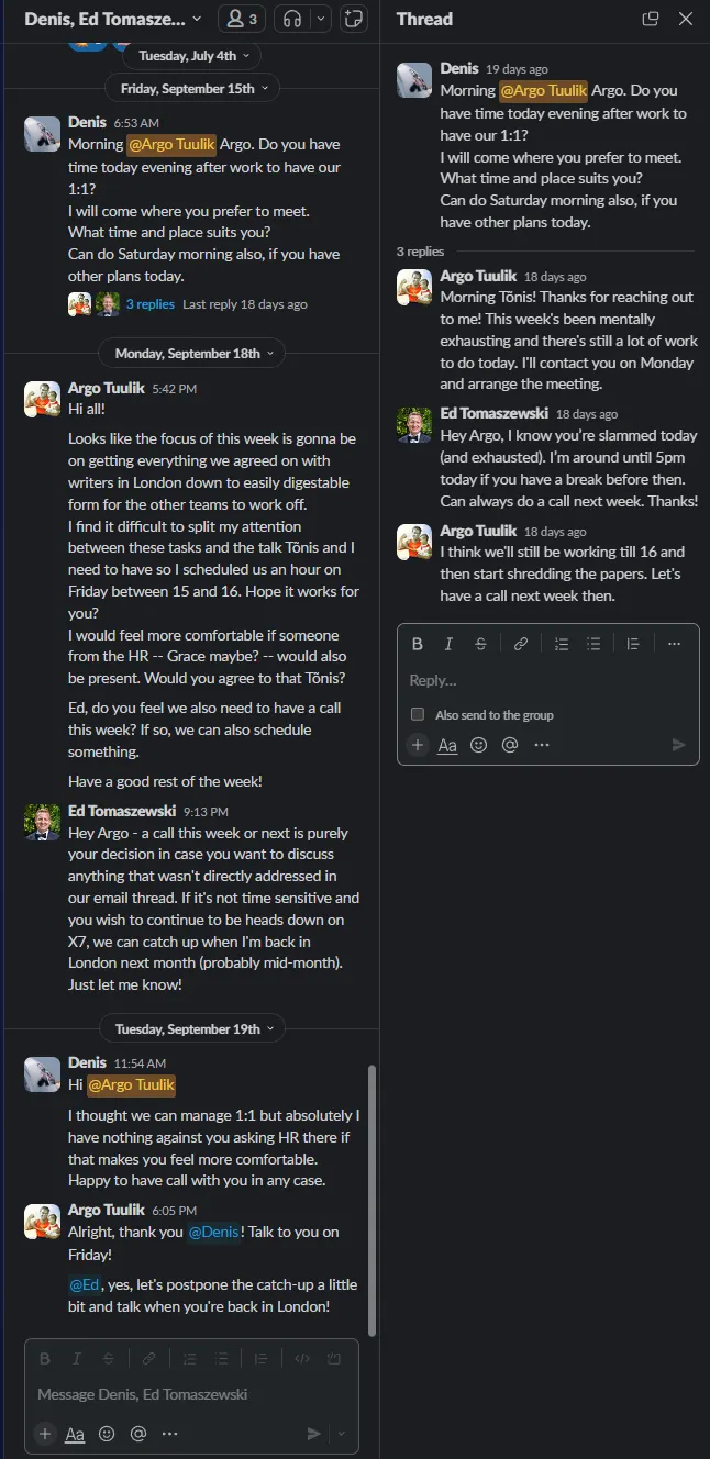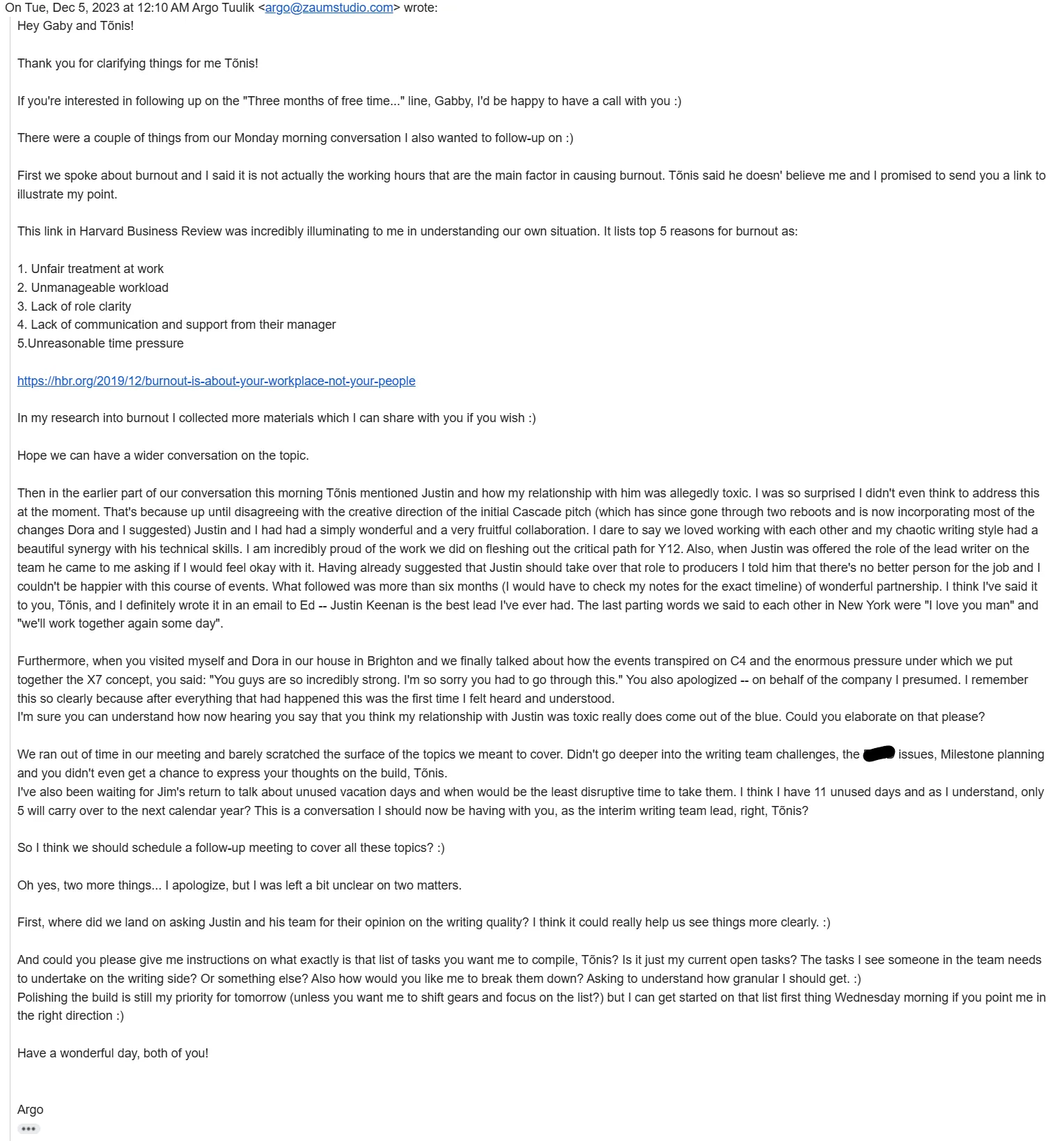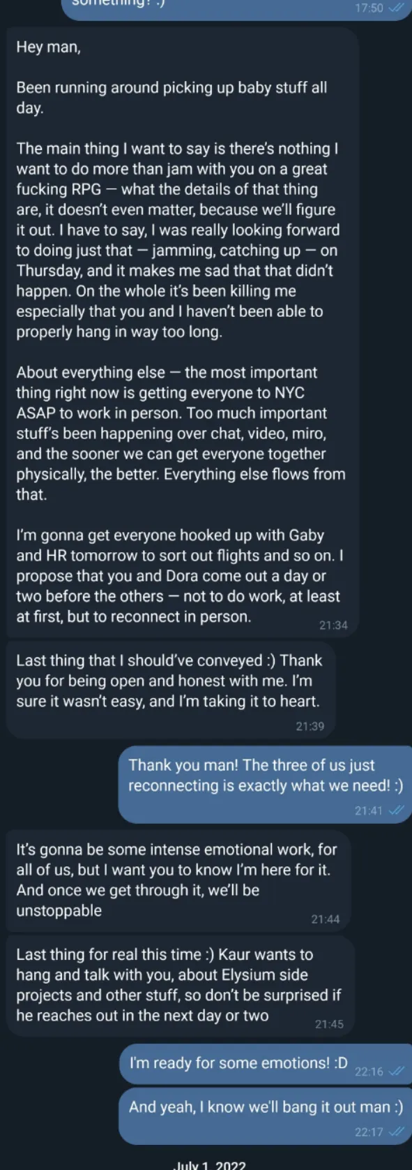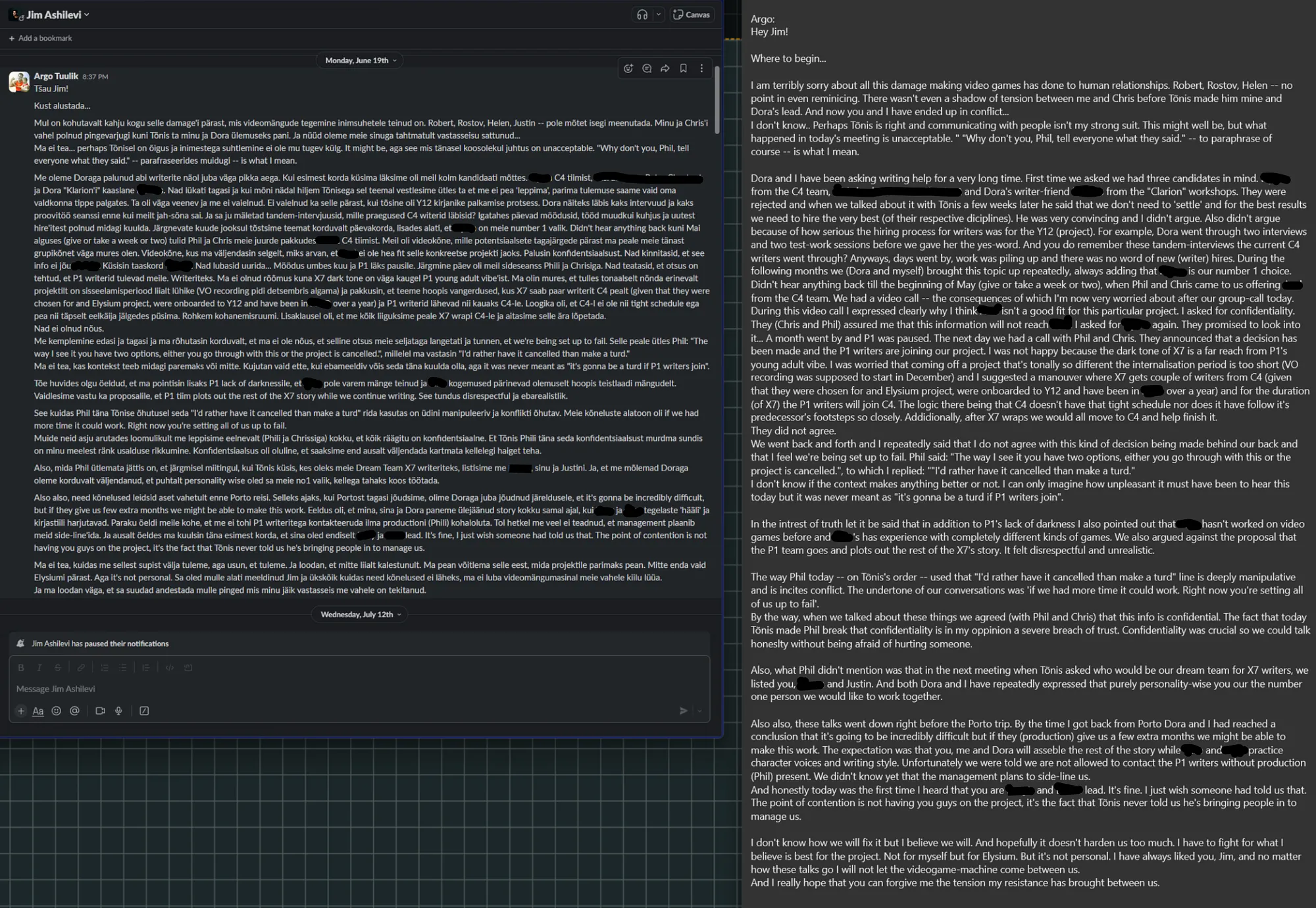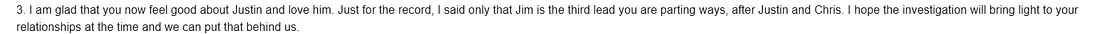 This comes as a complete shock. Never mind that Jim and I have been friends for a long time and always gotten along great, never mind that even during the last difficult months we’ve always tried to figure the situations out together, never mind that a harsh word has not been said between us… BUT our entire communication exists and is easily reviewable via slack messages and audio recordings.
