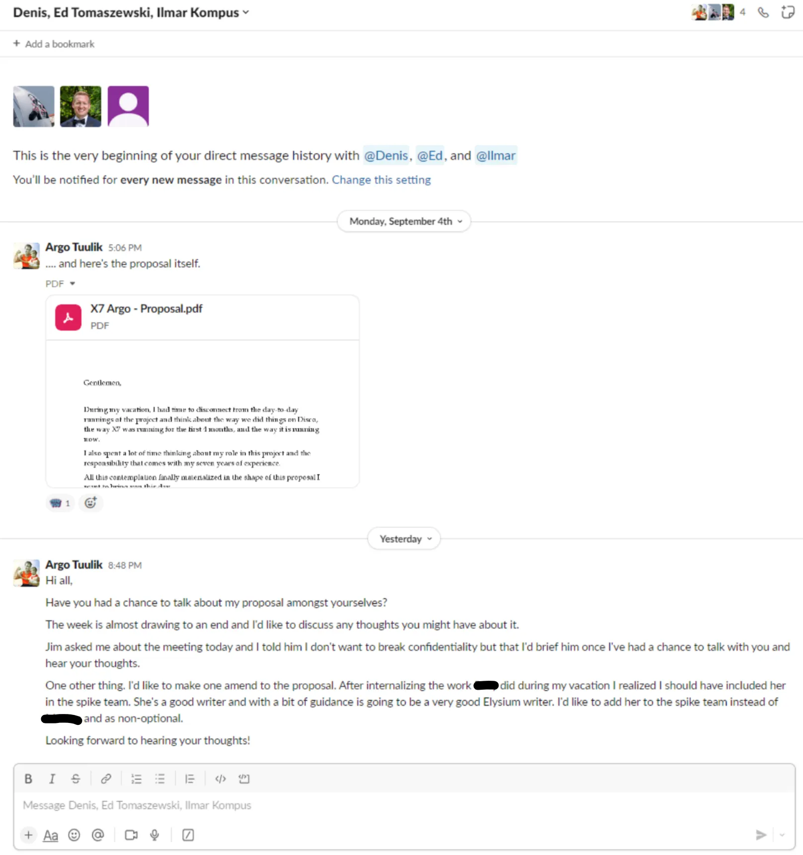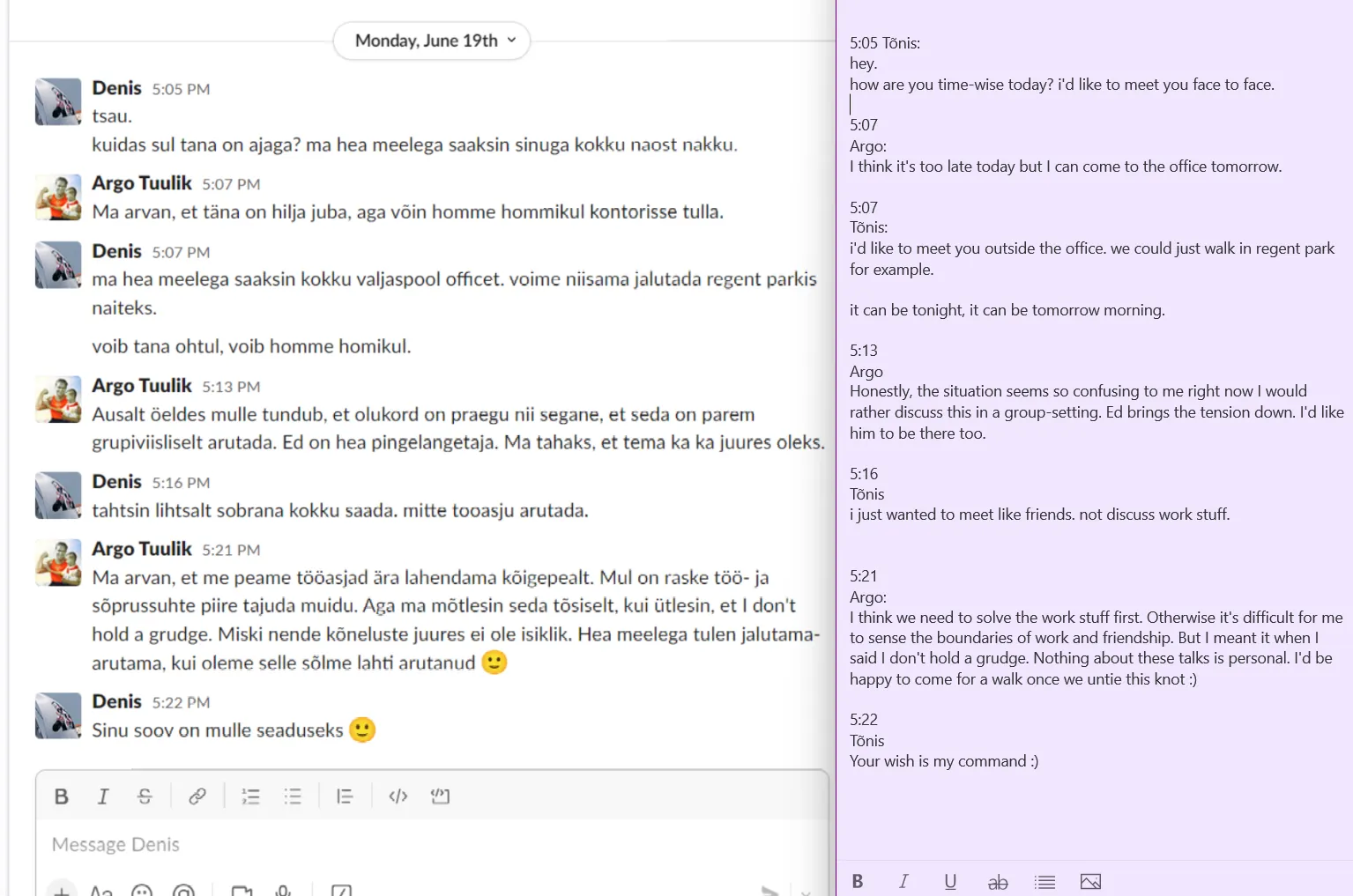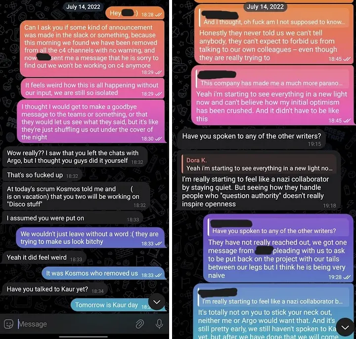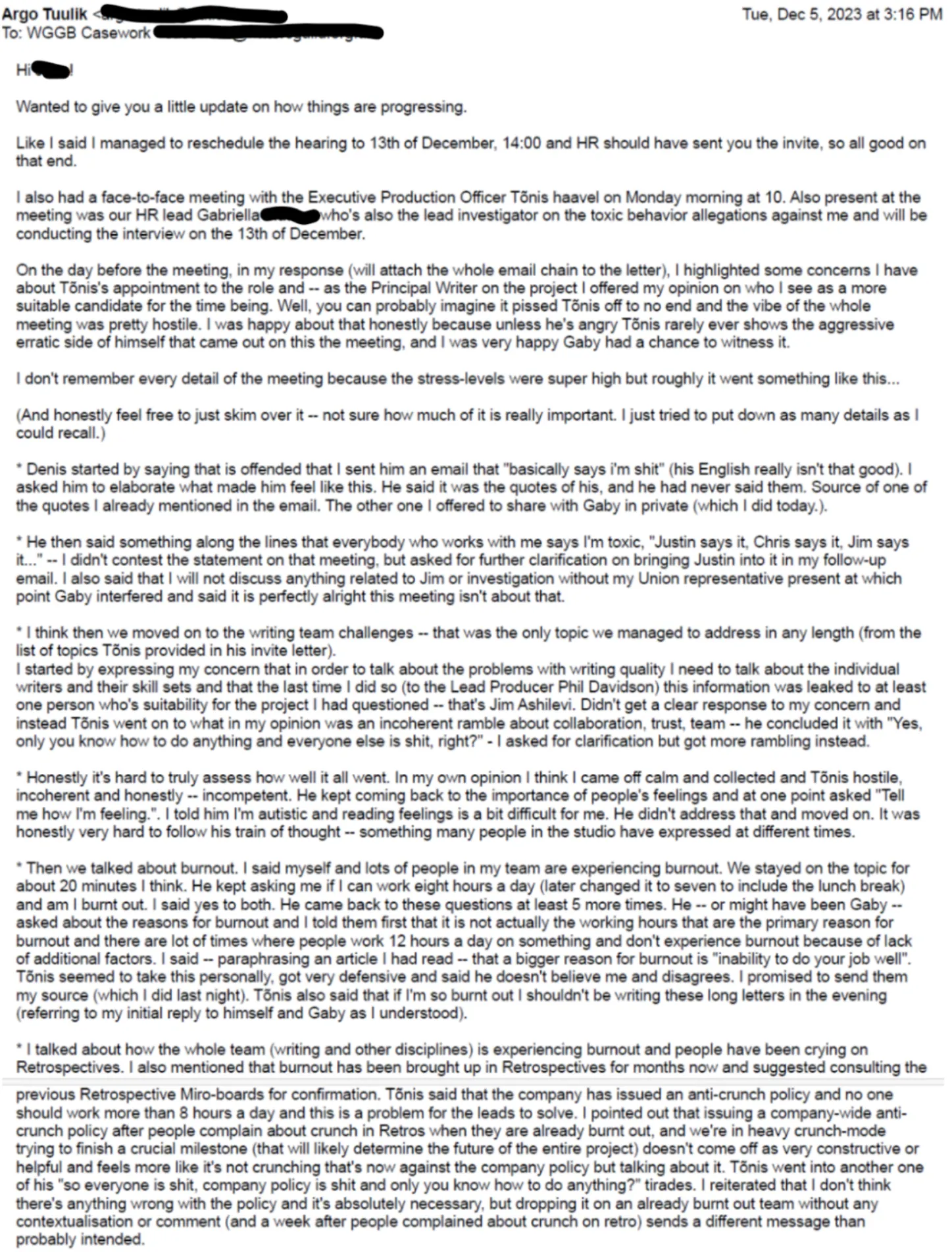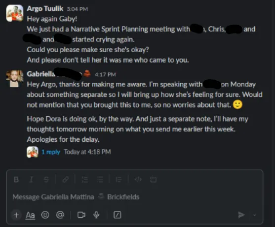 This comes as a complete shock. Never mind that Jim and I have been friends for a long time and always gotten along great, never mind that even during the last difficult months we’ve always tried to figure the situations out together, never mind that a harsh word has not been said between us… BUT our entire communication exists and is easily reviewable via slack messages and audio recordings.
