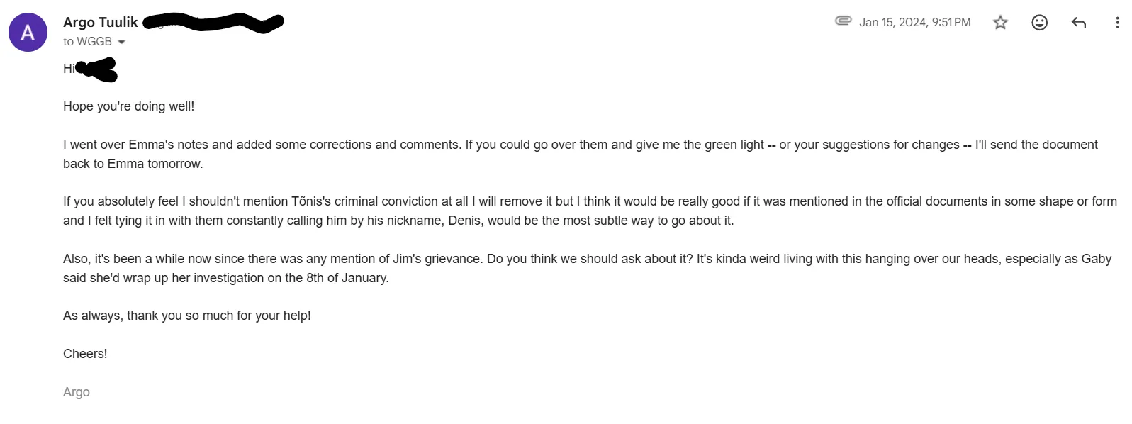 I ask my union rep if we should ask how Jim’s investigation is going. He