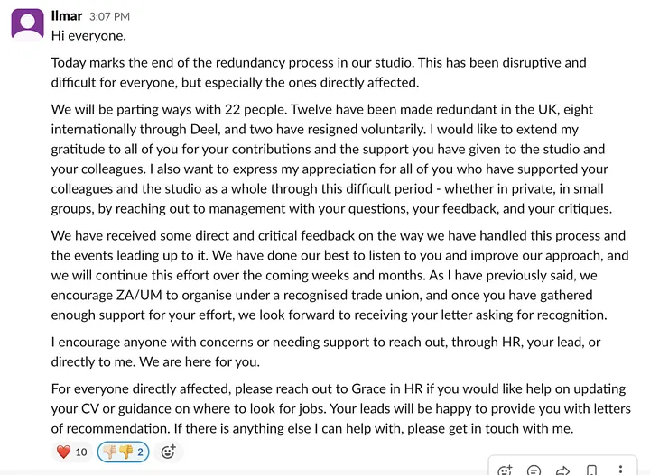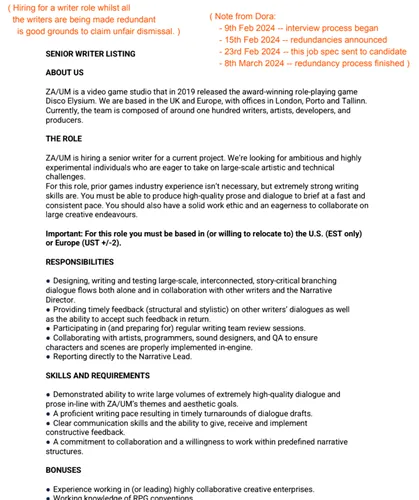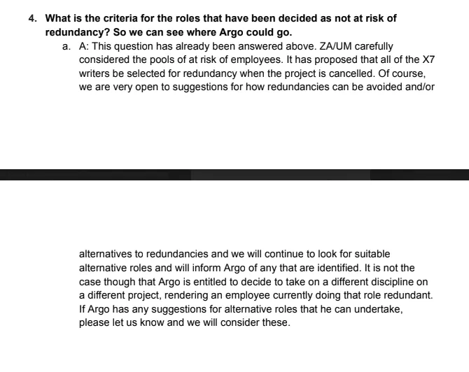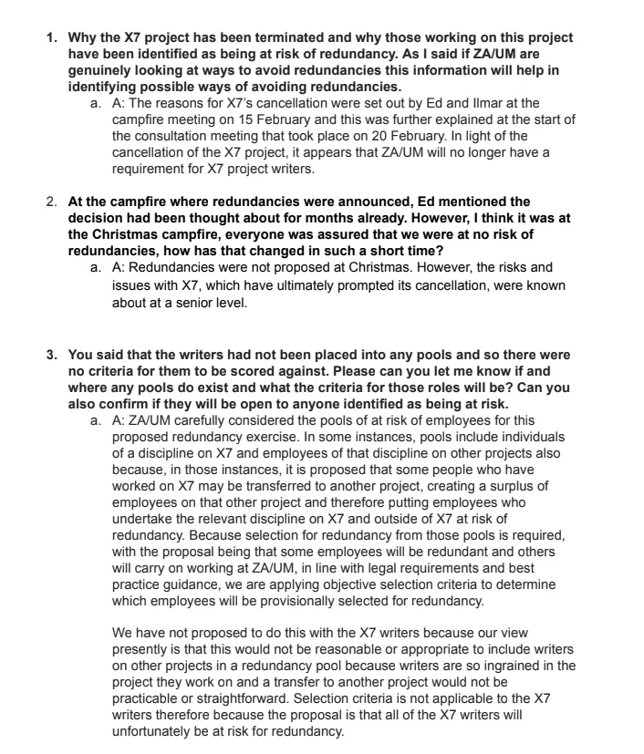 evidence that ZA/UM was hiring writers during the redundancy procedure,